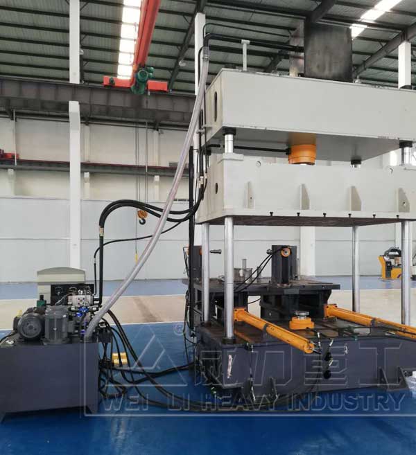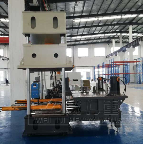 100吨碳纤维复合材料成型液压机是山东威力重工机床有限公司为徐州客户定做的专机,型号YW32-100T,工作台尺寸2000x1600mm,开口高度1000mm,行程800mm,并且带有移动工作台装置,以下是100吨碳纤维复合材料成型液压机车间实物图。